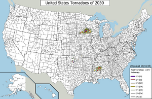 ![]() A map of 2030 United States tornado paths from the results of preliminary surveys. | |