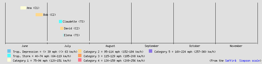 | Ana | June 12–16 | Category 1 hurricane | 90 (145) | 983 | Jamaica, Cuba, Bahamas, Southeast United States | $276 Million | 94 | |||